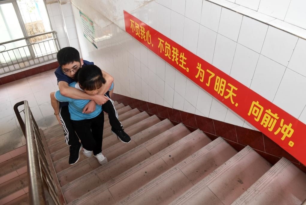 ?↑在廣西東蘭縣高級(jí)中學(xué),黃乜鮮背著兒子黃必華前往6樓的教室(2020年5月9日攝)。