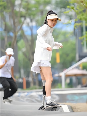 ?下圖為2023年6月20日,胡月在成都市錦江區(qū)輕極限運動公園練習滑板。(新華社記者 王曦 攝)
