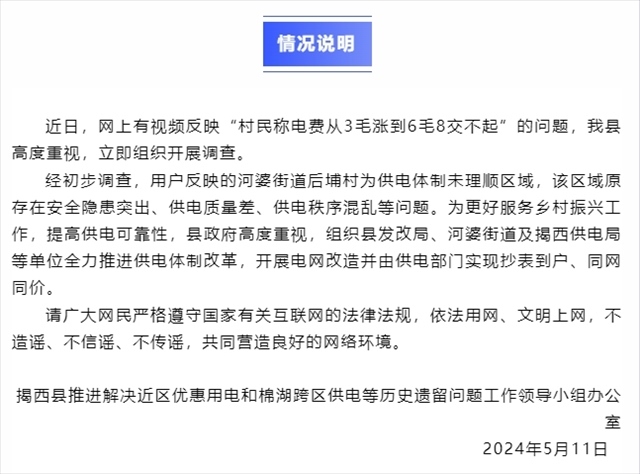 ·廣東揭陽一村電費(fèi)從3毛漲到6毛8?官方回應(yīng):開展電網(wǎng)改造并實(shí)現(xiàn)抄表到戶、同網(wǎng)同價(jià)。