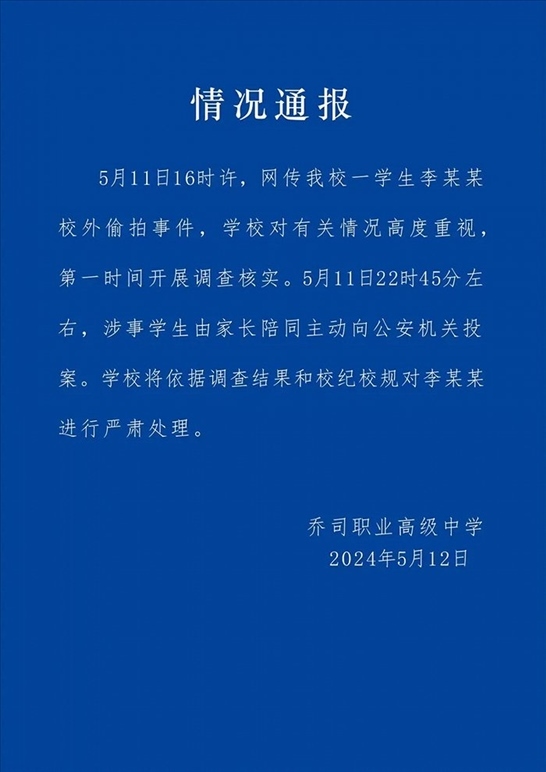 ·杭州市一職高通報(bào)學(xué)生校外偷拍女生裙底事件:涉事學(xué)生由家長陪同主動(dòng)投案。