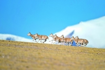 在羌塘國家級(jí)自然保護(hù)區(qū),一群雌性藏羚羊在奔跑。 新華社發(fā)