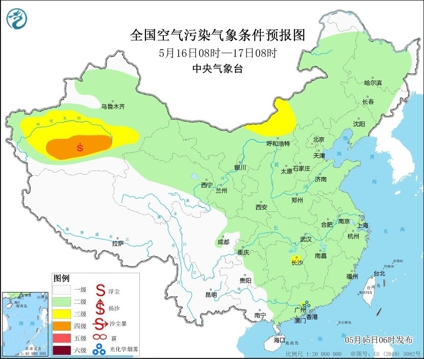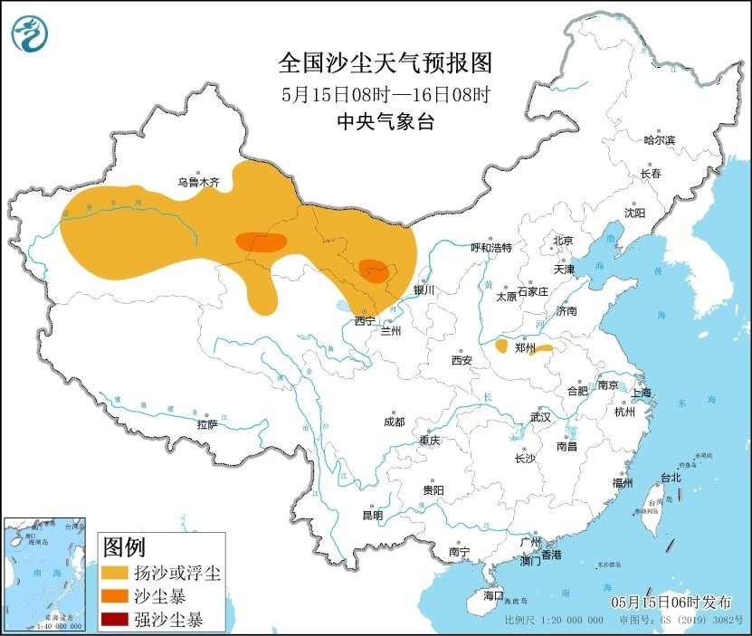 央視網消息:據中央氣象臺網站消息,預計,5月15日08時至16日08時,新疆南部和東部、甘肅西部、內蒙古西部、青海北部以及河南中部等地有揚沙或浮塵天氣,其中新疆東部、甘肅西部、內蒙古西部等地局地有沙塵暴,中央氣象臺5月15日06時繼續(xù)發(fā)布沙塵暴藍色預警。