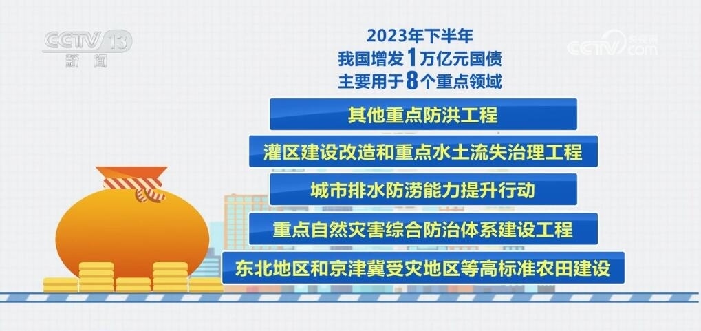 去年下半年,我國增發(fā)了1萬億元國債,主要用于8個重點領域,包括:災后恢復重建,支持以京津冀為重點的華北地區(qū)等災后恢復重建和提升防災減災能力,促進災區(qū)基本生產(chǎn)生活條件和經(jīng)濟發(fā)展恢復到災前的水平;以海河、松花江流域等北方地區(qū)為重點的骨干防洪治理工程;自然災害應急能力提升工程;其他重點防洪工程;灌區(qū)建設改造和重點水土流失治理工程;城市排水防澇能力提升行動;重點自然災害綜合防治體系建設工程;東北地區(qū)和京津冀受災地區(qū)等高標準農(nóng)田建設。