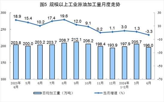 原油加工有所下降。4月份,規(guī)上工業(yè)原油加工量5879萬(wàn)噸,同比下降3.3%,3月份為增長(zhǎng)1.3%;日均加工196.0萬(wàn)噸。1—4月份,規(guī)上工業(yè)原油加工量24126萬(wàn)噸,同比增長(zhǎng)1.1%。