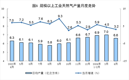 天然氣生產(chǎn)穩(wěn)定增長(zhǎng),進(jìn)口保持較快增長(zhǎng)。4月份,規(guī)上工業(yè)天然氣產(chǎn)量198億立方米,同比增長(zhǎng)3.2%,增速比3月份放緩1.3個(gè)百分點(diǎn);日均產(chǎn)量6.6億立方米。進(jìn)口天然氣1030萬(wàn)噸,同比增長(zhǎng)15.1%。