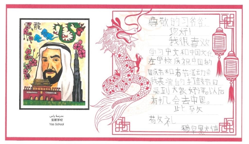 中文名叫“朱婉兒”的12年級(jí)學(xué)生朱韋雷婭在信中畫下龍與長(zhǎng)城,她說如今學(xué)中文的阿聯(lián)酋學(xué)生越來越多,“相信中阿友好關(guān)系將會(huì)更加緊密”。
