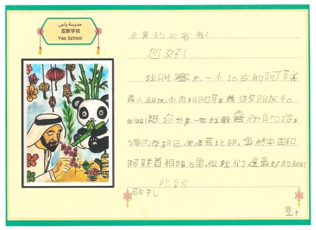 10歲的塞夫就讀于阿聯(lián)酋規(guī)模最大的公立學(xué)校亞斯學(xué)校。他在信中與習(xí)爺爺分享自己最喜歡的一句中國(guó)古詩——“海內(nèi)存知己,天涯若比鄰”,因?yàn)椤半m然中國(guó)和阿聯(lián)酋相隔萬里,但我們是最好的朋友!”