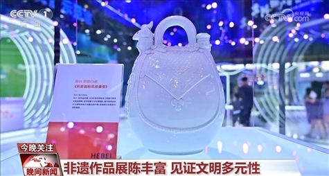 這是國家級(jí)非遺邢窯白瓷,它是根據(jù)河北衡水故城縣出土的唐代文物白釉鳳首蓋貼花皮囊壺創(chuàng)作的,呈現(xiàn)的是古代中原制瓷技藝與游牧民族文化的融合。