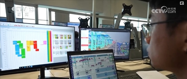 作為系統優(yōu)化師,范春奇全神貫注地盯著3個屏幕。左邊屏幕是碼頭調度指令,右邊是現場監(jiān)控的實時畫面,中間是智能水平運輸系統,顯示著所有車輛的運行軌跡。