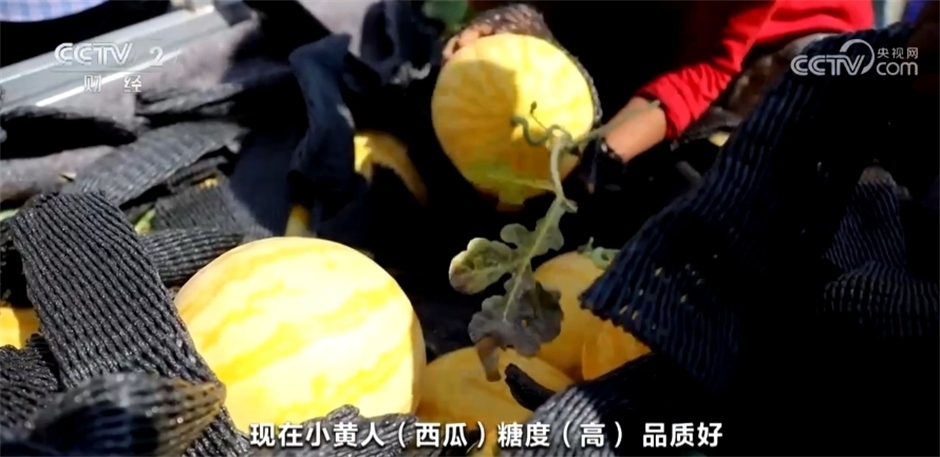 西瓜收購(gòu)商稱(chēng):“我今天來(lái)這兒收小黃人西瓜,發(fā)往鄭州、北京、上海,各個(gè)大城市都發(fā)。現(xiàn)在,小黃人西瓜糖度高、品質(zhì)好。