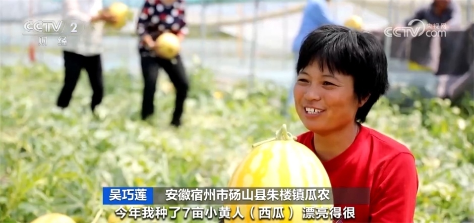 安徽碭山縣朱樓鎮(zhèn)瓜農(nóng)吳巧蓮介紹:“今年我種了7畝小黃人西瓜,漂亮得很,產(chǎn)量在8000斤左右,價(jià)格每斤3元左右,比普通的瓜一斤貴一元多。這個(gè)瓜賣(mài)30多元一個(gè)。”