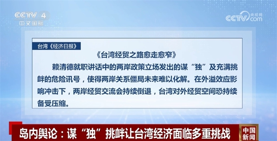 央視網(wǎng)消息:雖然島內(nèi)有關(guān)機構(gòu)預(yù)測今年臺灣經(jīng)濟增長率可達3%,但賴清德“5·20演說”卻傳遞出謀“獨”挑釁的危險信號。對此,島內(nèi)輿論和有關(guān)人士普遍擔(dān)心,臺海形勢緊張動蕩讓臺灣經(jīng)濟發(fā)展前景“烏云密布”。