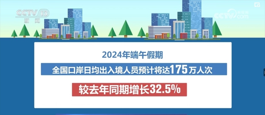央視網(wǎng)消息:記者6月6日從國(guó)家移民管理局獲悉,2024年端午假期,全國(guó)口岸日均出入境人員預(yù)計(jì)將達(dá)175萬(wàn)人次,較2023年同期增長(zhǎng)32.5%。