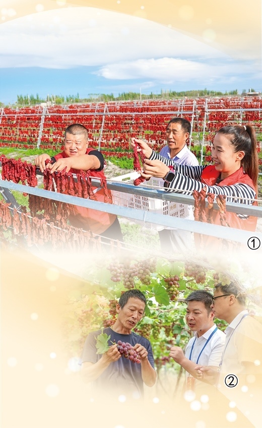 圖①:新疆維吾爾自治區(qū)博湖縣塔溫覺肯鄉(xiāng)辣椒曬場上,黨員志愿服務(wù)隊幫助村民晾曬辣椒。年 磊攝 圖②:浙江省淳安縣紀檢監(jiān)察干部走訪果農(nóng),聽取意見建議。謝航凱攝