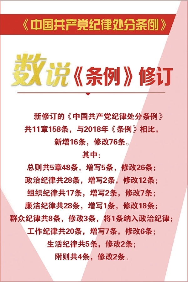 2023年新修訂的《中國共產(chǎn)黨紀(jì)律處分條例》,與時俱進完善紀(jì)律規(guī)范,與2018年《條例》相比,新增16條,修改76條,進一步扎緊織密制度籠子。
