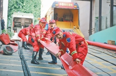 在安徽省合肥市瑤海區(qū),中國安能一局合肥救援基地排澇一組開展城市內(nèi)澇排險作業(yè)。劉溫馨 申屠建華攝影報道