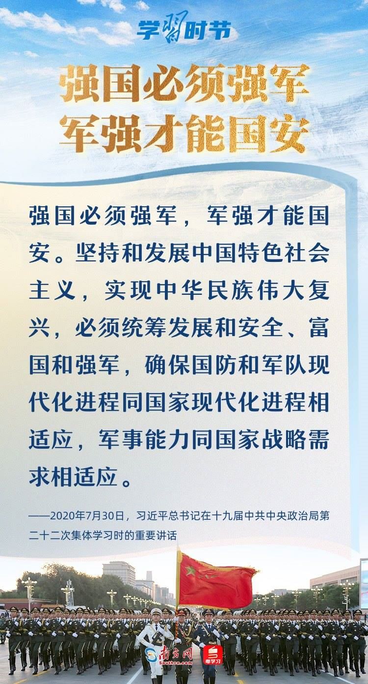 強(qiáng)國(guó)必須強(qiáng)軍,軍強(qiáng)才能?chē)?guó)安。黨的十八大以來(lái),以習(xí)近平同志為核心的黨中央領(lǐng)導(dǎo)軍隊(duì)和國(guó)防建設(shè),開(kāi)啟強(qiáng)軍興軍新征程,形成了習(xí)近平強(qiáng)軍思想,指引人民軍隊(duì)朝著實(shí)現(xiàn)新時(shí)代強(qiáng)軍目標(biāo)、全面建成世界一流軍隊(duì)奮勇前行。在八一建軍節(jié)到來(lái)之際,讓我們一起回顧總書(shū)記那些振奮人心的強(qiáng)軍話語(yǔ)。