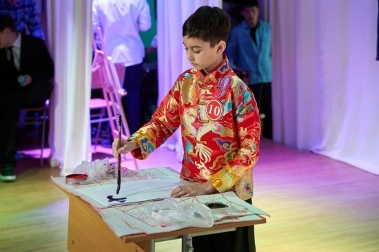 4月9日,在俄羅斯符拉迪沃斯托克,一名小學生展示中文書法。2024年中小學生“漢語橋”中文比賽4月9日在符拉迪沃斯托克市國際語言學校舉行。新華社發(fā)