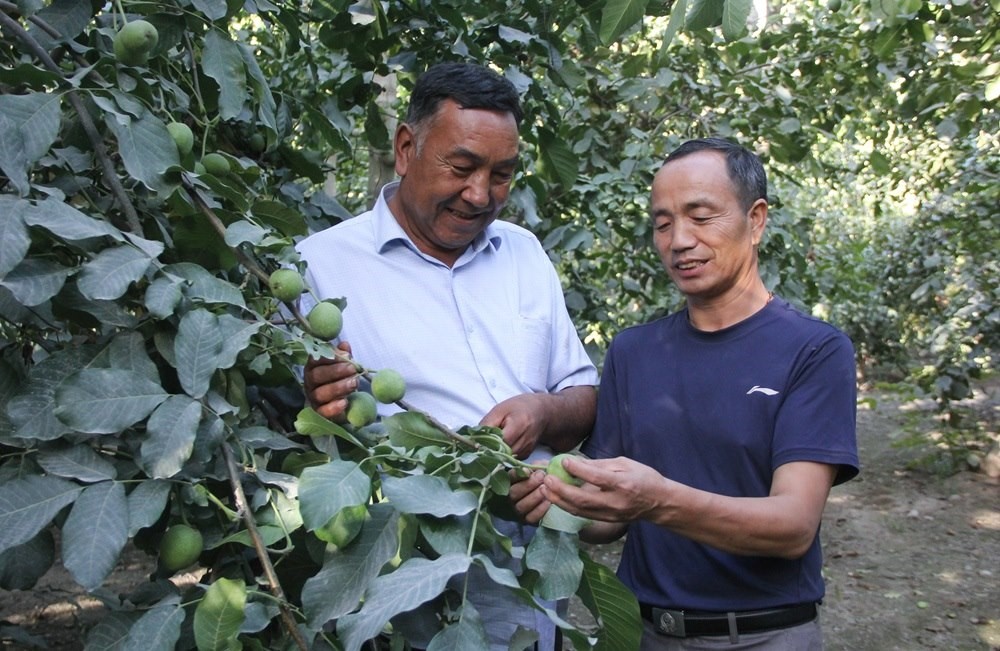 2023年8月29日,在新疆溫宿縣柯柯牙鎮(zhèn),果農(nóng)趙武中(右)、木合旦·吐爾迪在他們經(jīng)營的核桃園里查看核桃生長情況。新華社記者 李響攝