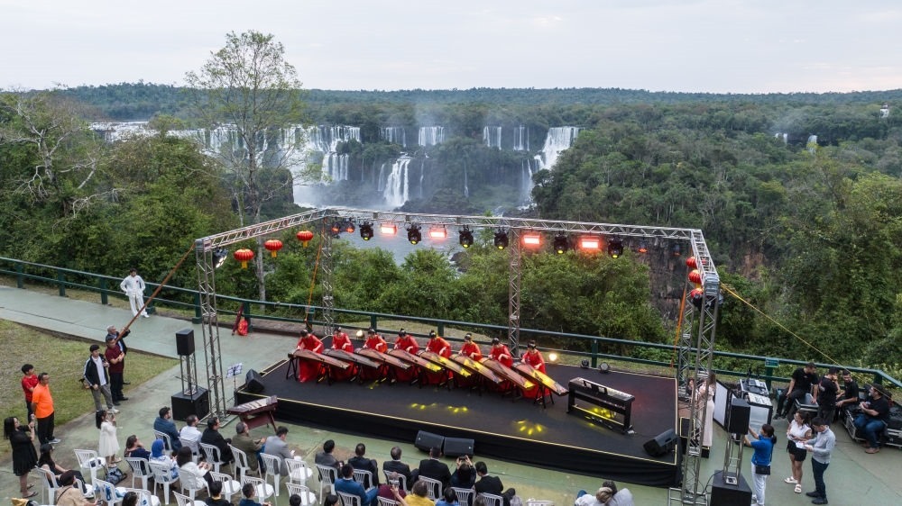 2023年9月29日,演員在巴西伊瓜蘇瀑布前舉行的中秋晚會上演奏古箏,慶祝中國傳統(tǒng)節(jié)日中秋佳節(jié)。