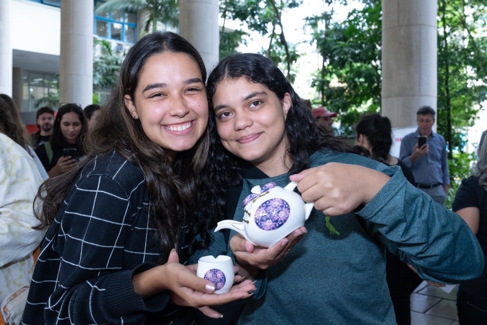 2024年4月18日,在巴西里約熱內(nèi)盧舉行的聯(lián)合國中文日活動上,巴西學(xué)生手持中國工藝品合影。