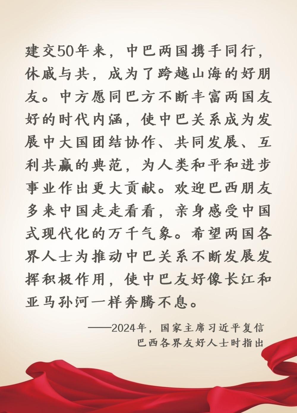 2023年4月,習(xí)近平主席同來華進(jìn)行國事訪問的巴西總統(tǒng)盧拉舉行會談時,談到雙方要以2024年慶祝建交50周年為契機(jī),繼續(xù)推動中巴友好。