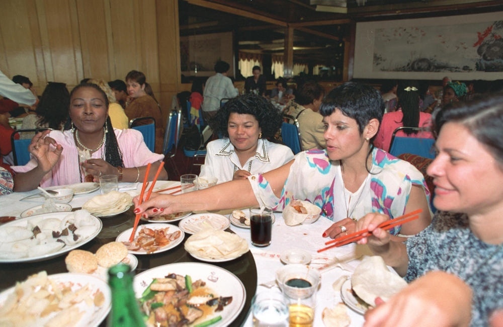 1995年9月10日,來華參加世界婦女大會的巴西代表結(jié)伴來到北京和平門全聚德烤鴨店,品嘗北京烤鴨。