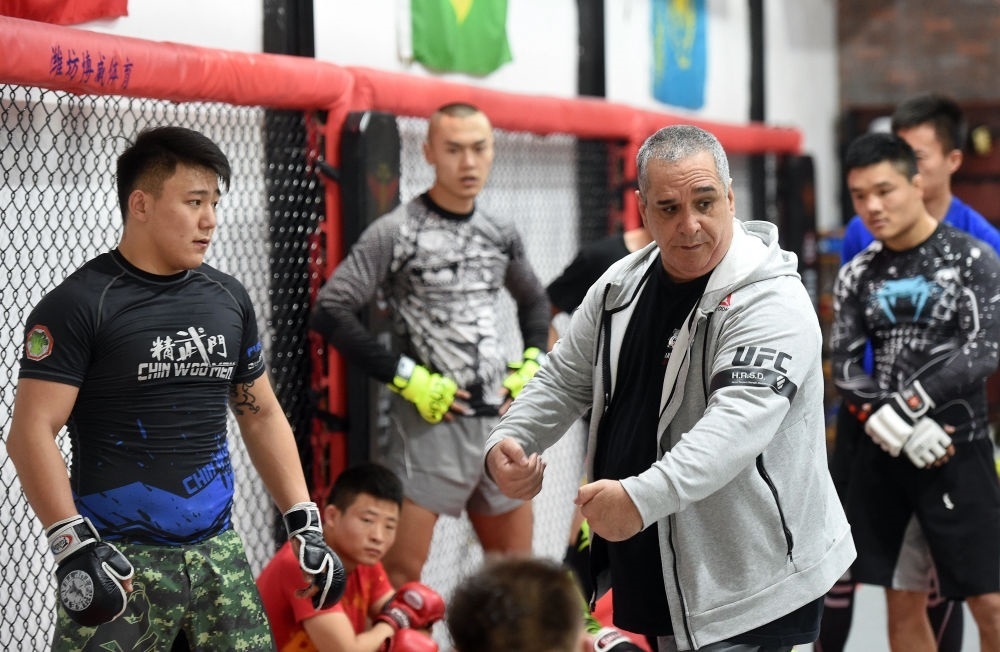 2019年11月6日,來自巴西里約熱內(nèi)盧的柔術(shù)教練魯伊·梅內(nèi)賽斯在北京一家搏擊館講解動作要領(lǐng)。
