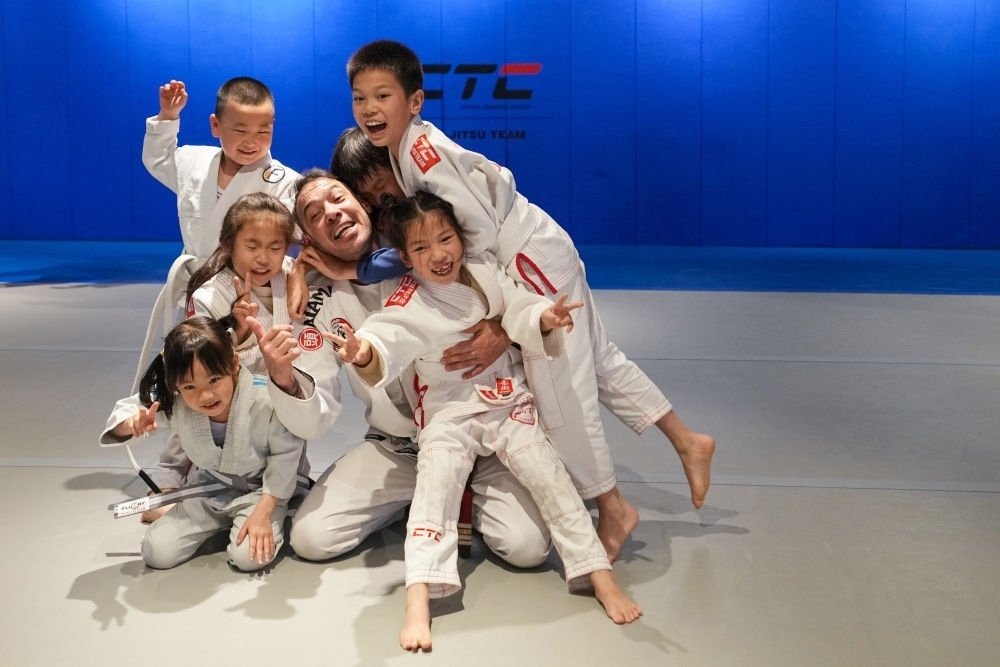 2023年4月7日,在北京一家格斗館內(nèi),巴西柔術(shù)教練席爾瓦(中)在一堂柔術(shù)課結(jié)束后與學(xué)生們合影留念。為了更好地了解中國和傳統(tǒng)武術(shù),席爾瓦于2016年來到北京,在一家格斗館擔(dān)任巴西柔術(shù)教練。