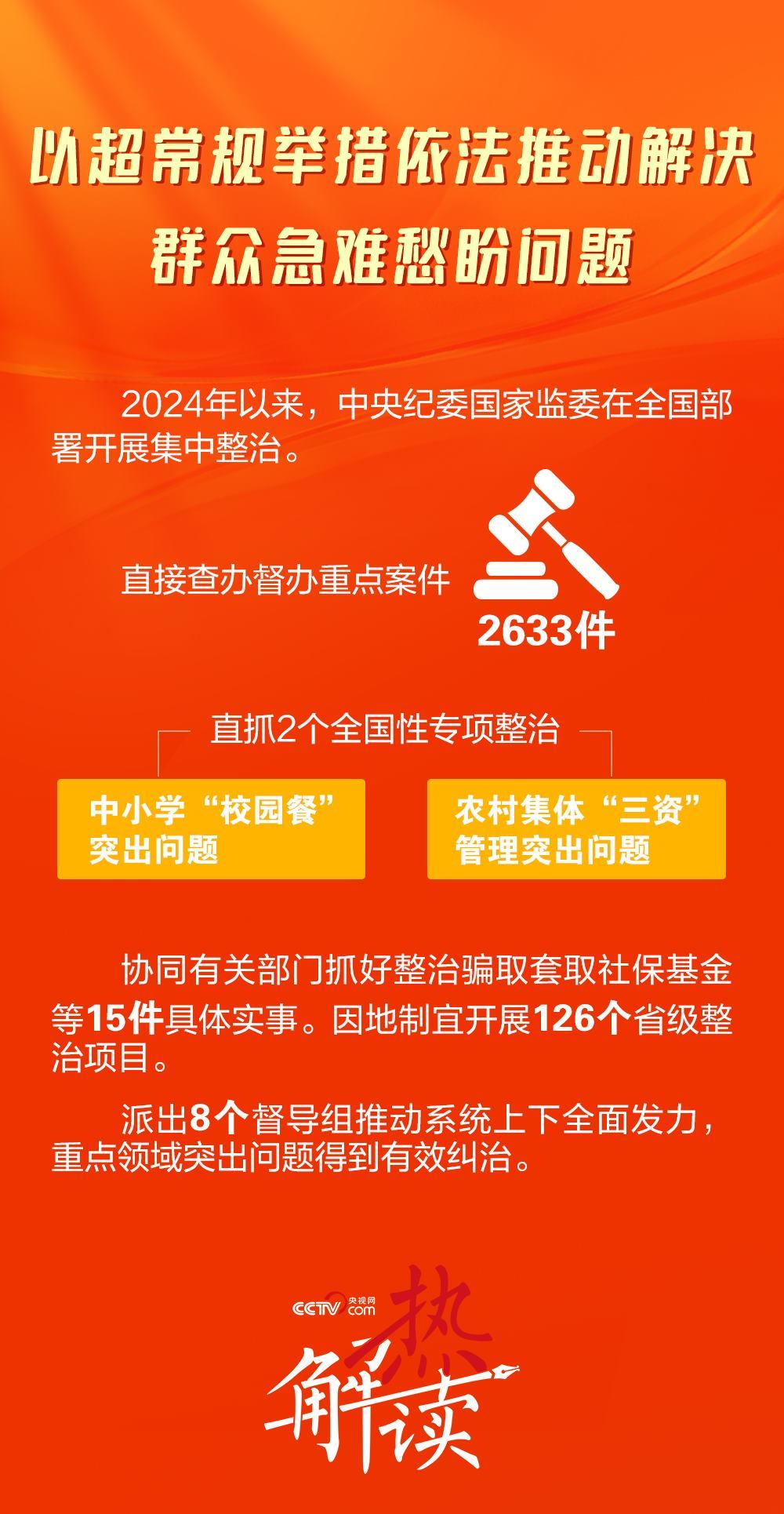 2024年1月8日,在二十屆中央紀委三次全會上,習近平總書記明確要求懲治“蠅貪蟻腐”,讓群眾有更多獲得感。全會強調瞄準教育、就業(yè)、醫(yī)療等民生領域的痛點難點開展集中整治。此次召開的二十屆中央紀委四次全會,更加明確民生領域腐敗問題整治方向——聚焦“縣以下這一關鍵環(huán)節(jié)、薄弱環(huán)節(jié)”,直達正風肅紀反腐“最后一公里”。