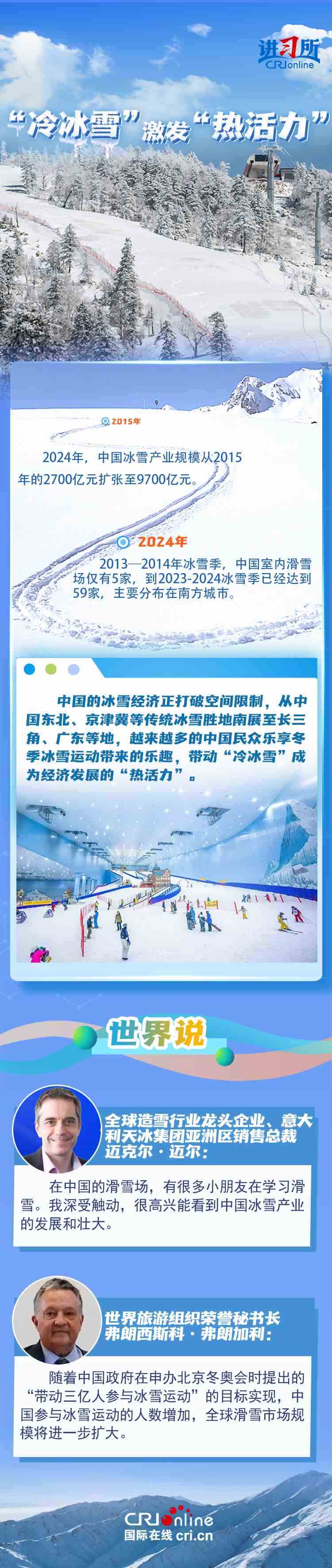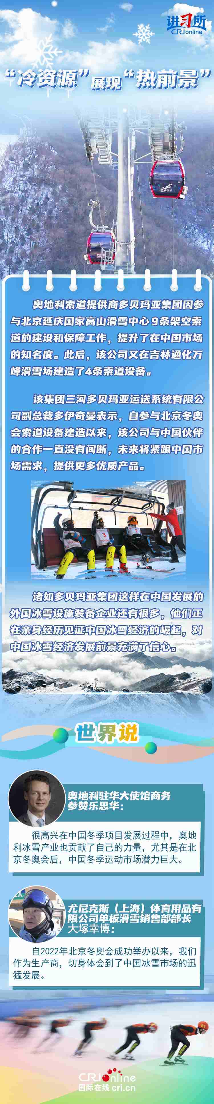 去年年底,中國國務院辦公廳印發(fā)《關于以冰雪運動高質(zhì)量發(fā)展激發(fā)冰雪經(jīng)濟活力的若干意見》,旨在鞏固和擴大“帶動三億人參與冰雪運動”成果,以冰雪運動為引領,帶動冰雪文化、冰雪裝備、冰雪旅游全產(chǎn)業(yè)鏈發(fā)展,推動冰雪經(jīng)濟成為新增長點。不少國際組織、企業(yè)和媒體認為,中國冰雪經(jīng)濟的蓬勃發(fā)展,不僅帶來新合作機遇,更為全球冰雪市場貢獻力量。