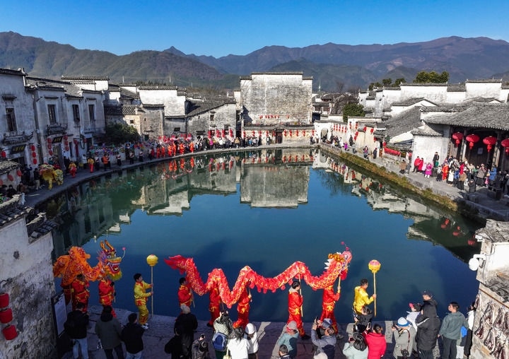 2025年1月18日,民俗表演隊在安徽省黃山市黟縣宏村巡游(無人機(jī)照片)。新華社發(fā)(施亞磊 攝)
