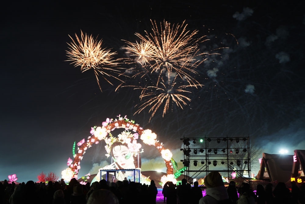 2025年1月12日,游客們?cè)谏蜿柹虮毙聟^(qū)稻夢小鎮(zhèn)觀看焰火表演。