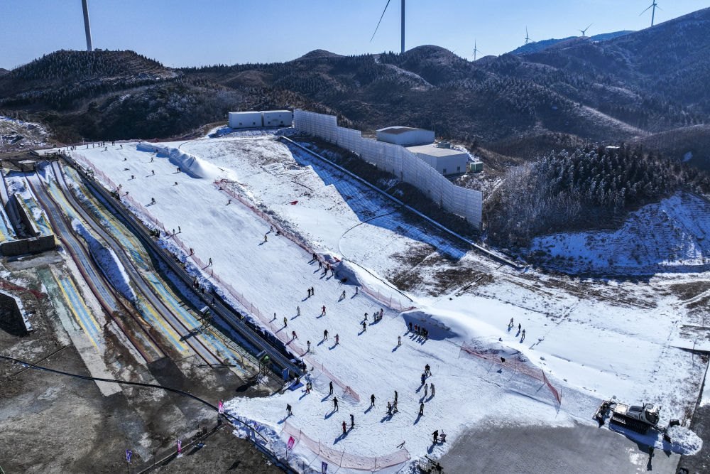 2025年1月23日,游客在湖北神農(nóng)架中和國(guó)際滑雪場(chǎng)滑雪。湖北省神農(nóng)架林區(qū)冬季降雪量豐富、雪質(zhì)蓬松,為中部地區(qū)滑雪愛好者提供了良好的練習(xí)環(huán)境。