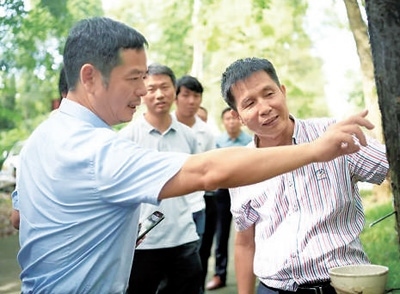 全國政協(xié)委員、中國科學(xué)院院士黃三文(左一)在海南省儋州市調(diào)研橡膠產(chǎn)業(yè)科技創(chuàng)新情況。