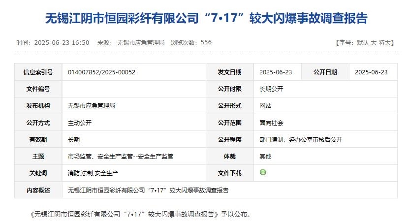 調(diào)查認定,無錫江陰市恒園彩纖有限公司“7·17”較大閃爆事故是一起因崗位員工盲目操作,生產(chǎn)單元安全設(shè)施缺失,現(xiàn)場應(yīng)急處置不當,地方黨委、政府及其有關(guān)部門履職不到位而導(dǎo)致的較大生產(chǎn)安全責(zé)任事故。