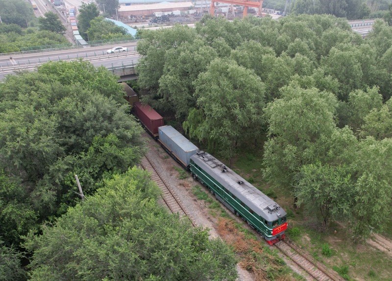 6月30日,北京至阿塞拜疆巴庫(kù)的跨里海中歐班列??吭谖挥诒本┦蟹可絽^(qū)的北京國(guó)際陸港等待發(fā)車(無(wú)人機(jī)照片)。