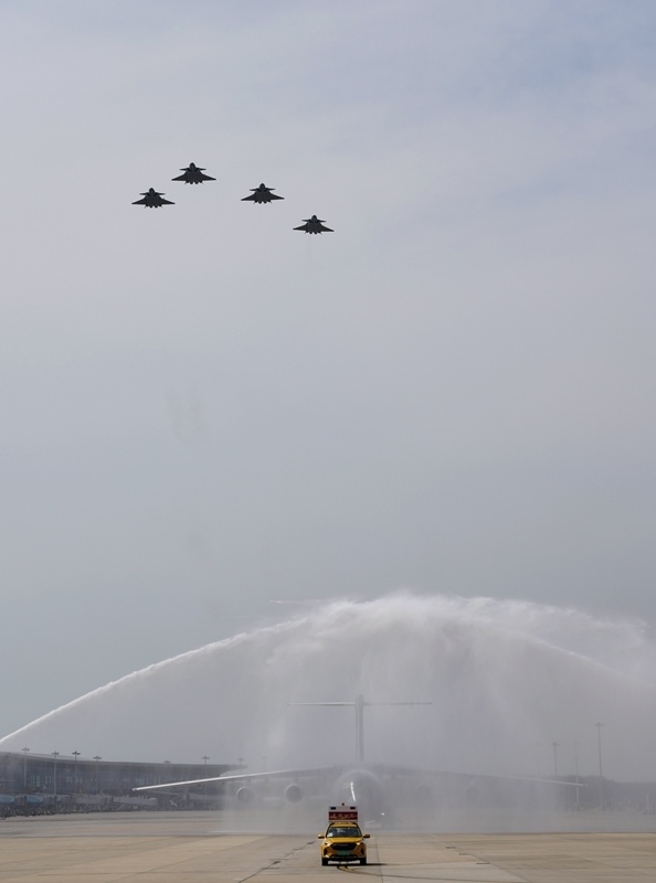 9月12日,第十二批在韓中國人民志愿軍烈士遺骸回國。這是在沈陽桃仙國際機(jī)場(chǎng),接運(yùn)烈士遺骸回國的運(yùn)-20專機(jī)通過水門。