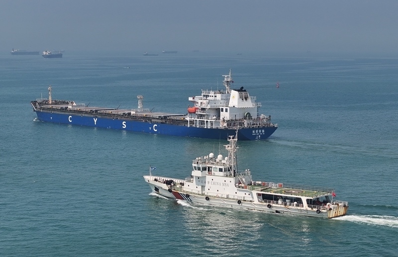 7月18日,曹妃甸海事局的巡邏船(前)在唐山港曹妃甸港區(qū)海域?yàn)檫M(jìn)出港輪船護(hù)航(無人機(jī)照片)。