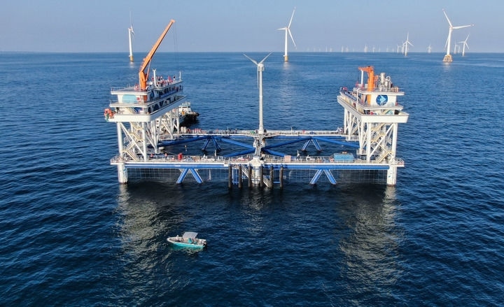 這是在廣東汕尾拍攝的中廣核“伏羲一號(hào)”風(fēng)漁融合網(wǎng)箱平臺(tái)(2024年9月2日攝,無(wú)人機(jī)照片)。新華社記者 鄧華 攝