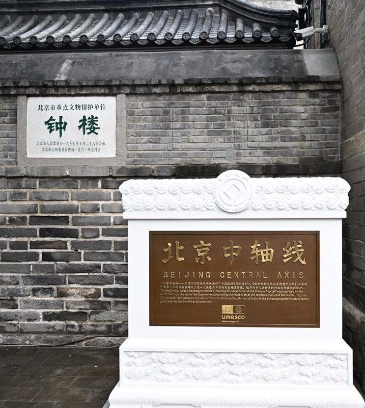 這是7月27日在北京鐘樓前拍攝的北京中軸線世界文化遺產標志碑。