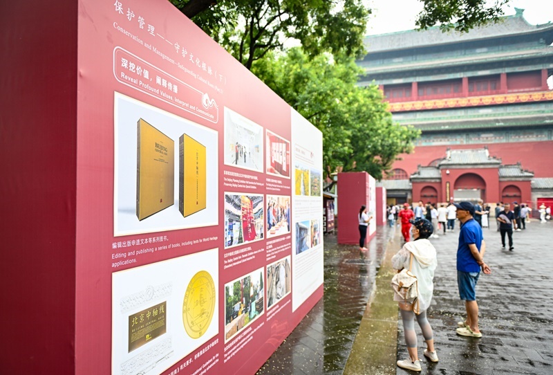 7月27日,人們在北京鐘鼓樓廣場上觀看介紹北京中軸線申遺成功一周年成果的展板。