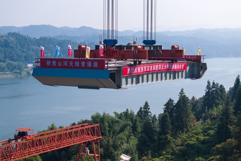 8月3日,在張官高速洞庭溪沅水特大橋施工現(xiàn)場,一塊鋼混結合梁在被緩緩提升(無人機照片)。