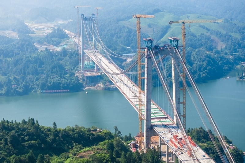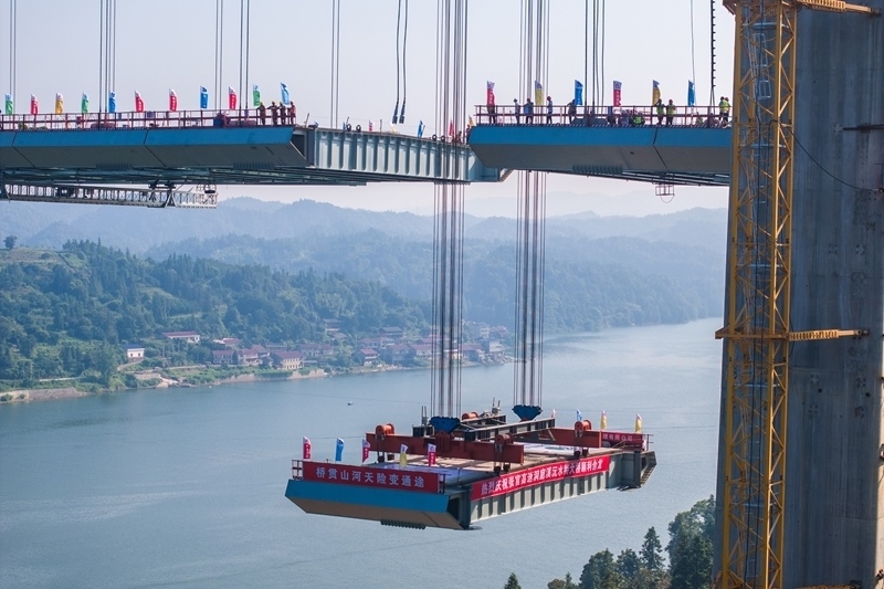 當日,隨著最后一段200余噸重的鋼混結合梁被緩緩提升,由湖南路橋建設集團承建的張官高速控制性工程洞庭溪沅水特大橋主橋順利合龍,為2026年全線通車奠定了堅實基礎。據(jù)了解,洞庭溪沅水特大橋位于湖南懷化市沅陵縣境內,全長1707米,主橋長800米,為雙塔單跨懸索橋。