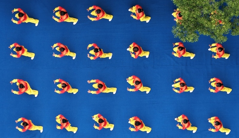 8月8日,在江蘇省揚(yáng)州市宋夾城體育休閑公園,健身愛好者練習(xí)太極拳(無人機(jī)照片)。