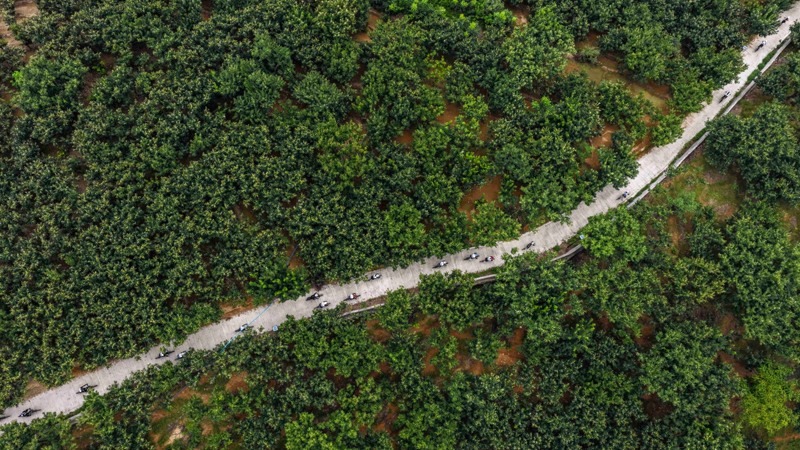 8月8日,騎行愛好者在河北省遵化市蘇家洼鎮(zhèn)二道嶺村騎行(無人機(jī)照片)。