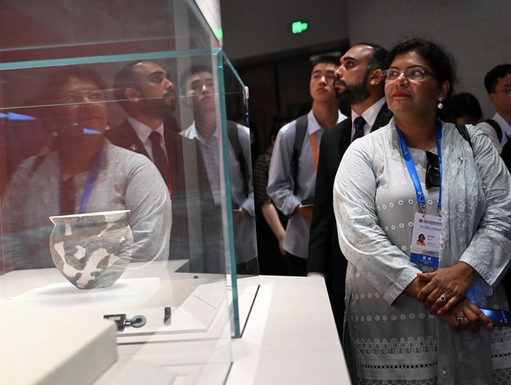 2025年7月24日,上海合作組織媒體智庫(kù)峰會(huì)子活動(dòng)“文化遺產(chǎn)保護(hù)利用交流合作會(huì)”的參會(huì)嘉賓在鄭州大河村遺址博物館新館參觀。新華社記者 李嘉南 攝