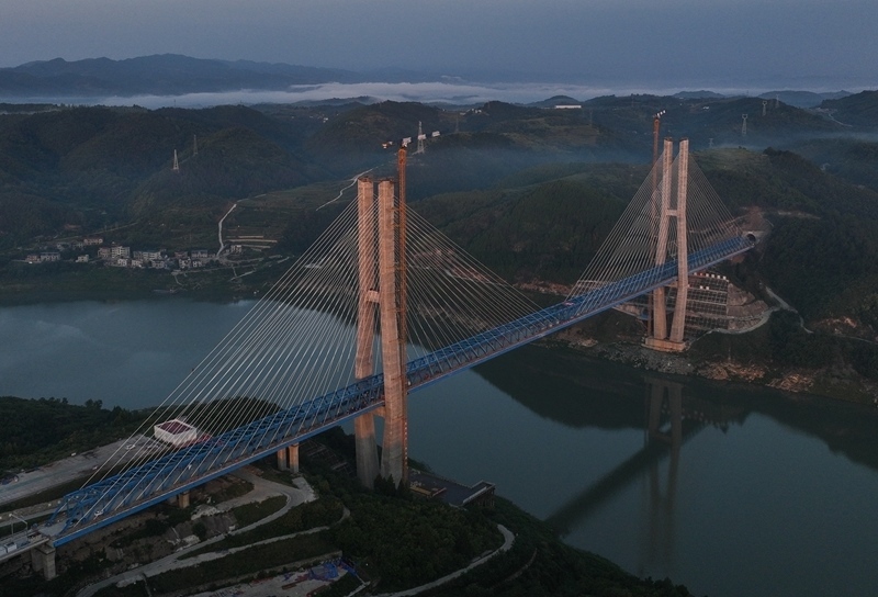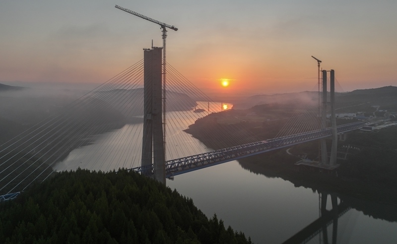 8月18日,由中鐵十一局承建的西安至十堰高速鐵路(簡稱“西十高鐵”)漢江特大橋鋼桁梁順利合龍。漢江特大橋位于湖北省十堰市,跨越丹江口水庫庫區(qū),是西十高鐵全線控制性工程,全長917.45米,主跨420米。本次合龍的鋼桁梁全長840米、寬11米、高9.4米,采用漸變三角桁式結構,最重桁節(jié)36.4噸。