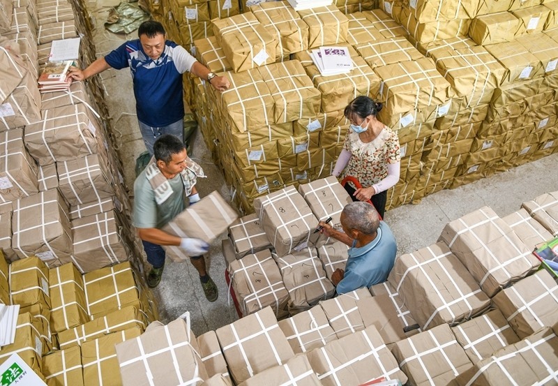 8月25日,在湖南省永州市道縣新華書店倉(cāng)庫(kù),工作人員在搬運(yùn)新學(xué)期教材。