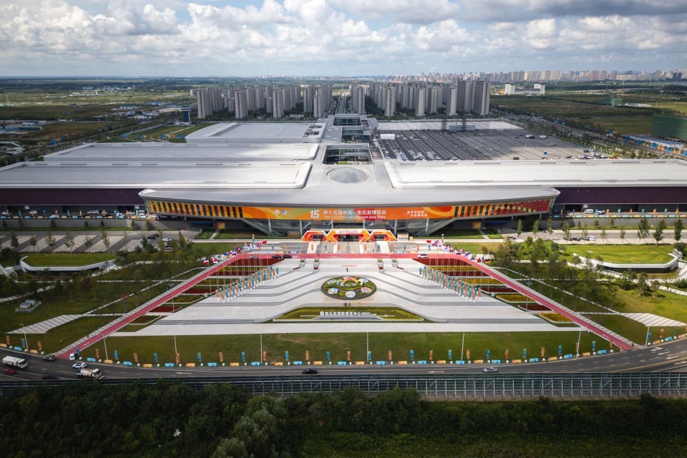 這是2025年8月26日拍攝的第十五屆中國—東北亞博覽會展館外景(無人機照片)。新華社記者 許暢 攝